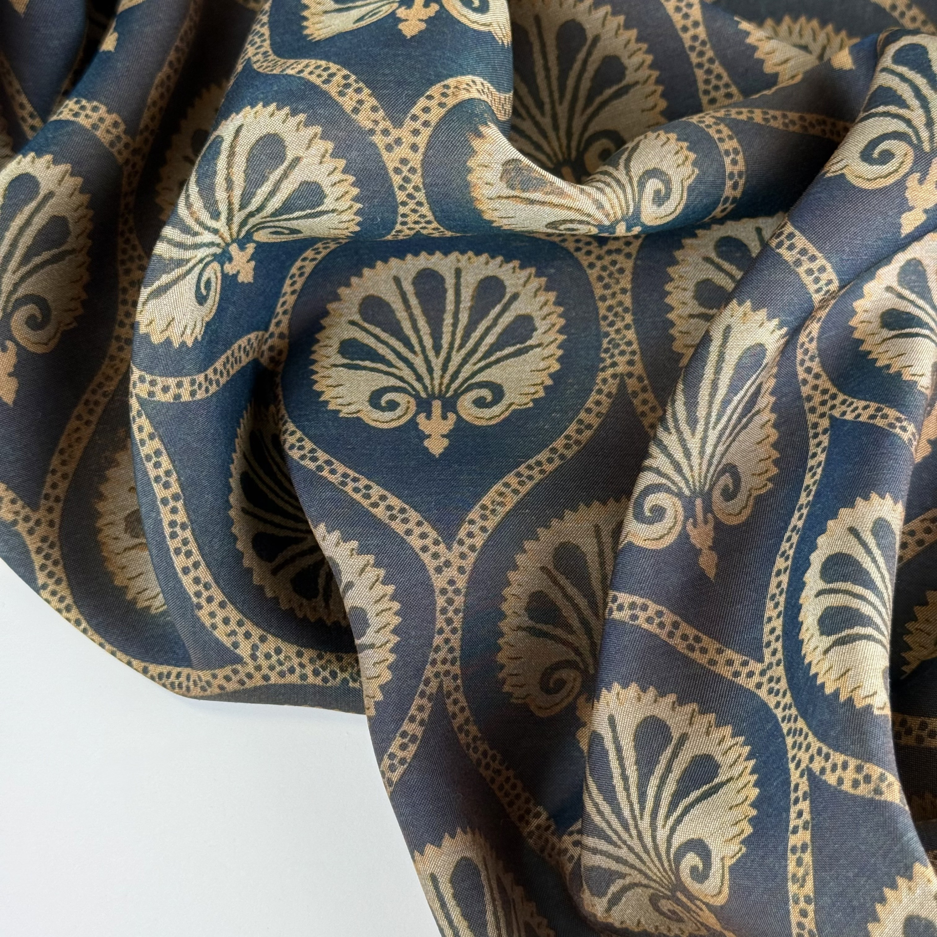 Плательная ткань с сатиновым переплетением, небольшим блеском, немного тянется, не просвечивает. Визуально напоминает шелк. Легкая, хорошо драпируется, не электризуется, дышит. Подойдет для блуз, платьев, костюмов в пижамном стиле, домашней одежды.