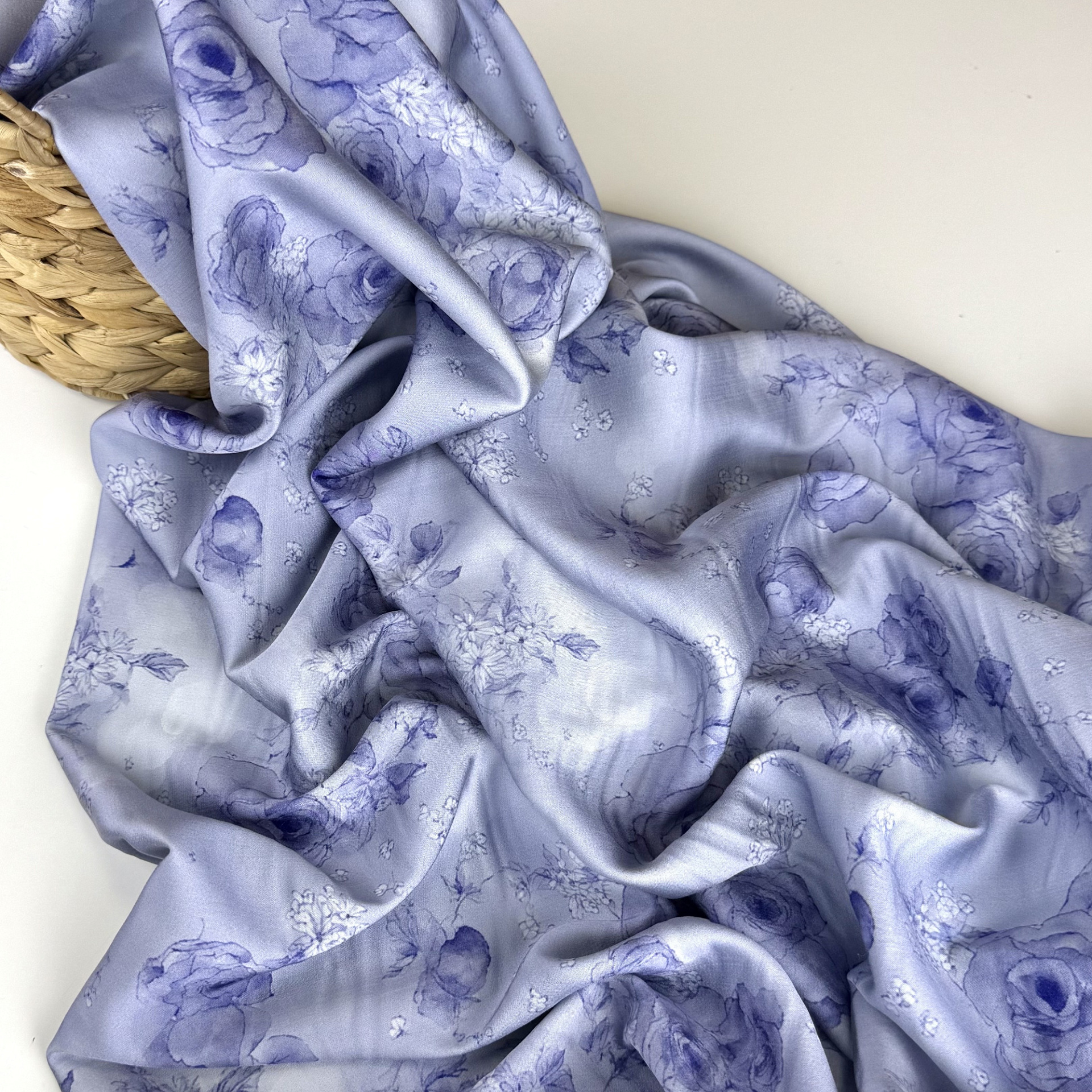 Плательная ткань с сатиновым переплетением, небольшим блеском, немного тянется, не просвечивает. Визуально напоминает шелк. Легкая, хорошо драпируется, не электризуется, дышит. Подойдет для блуз, платьев, костюмов в пижамном стиле, домашней одежды.