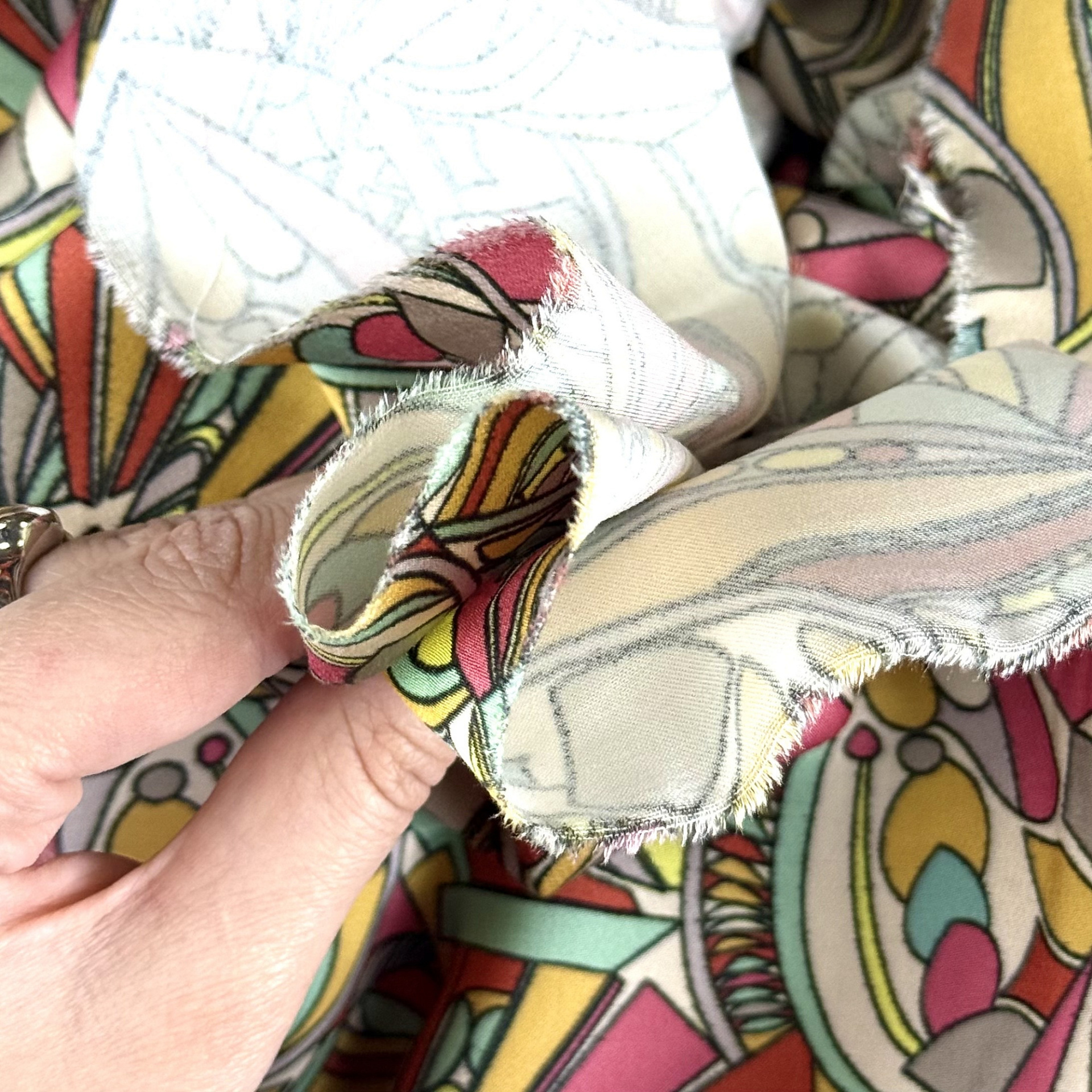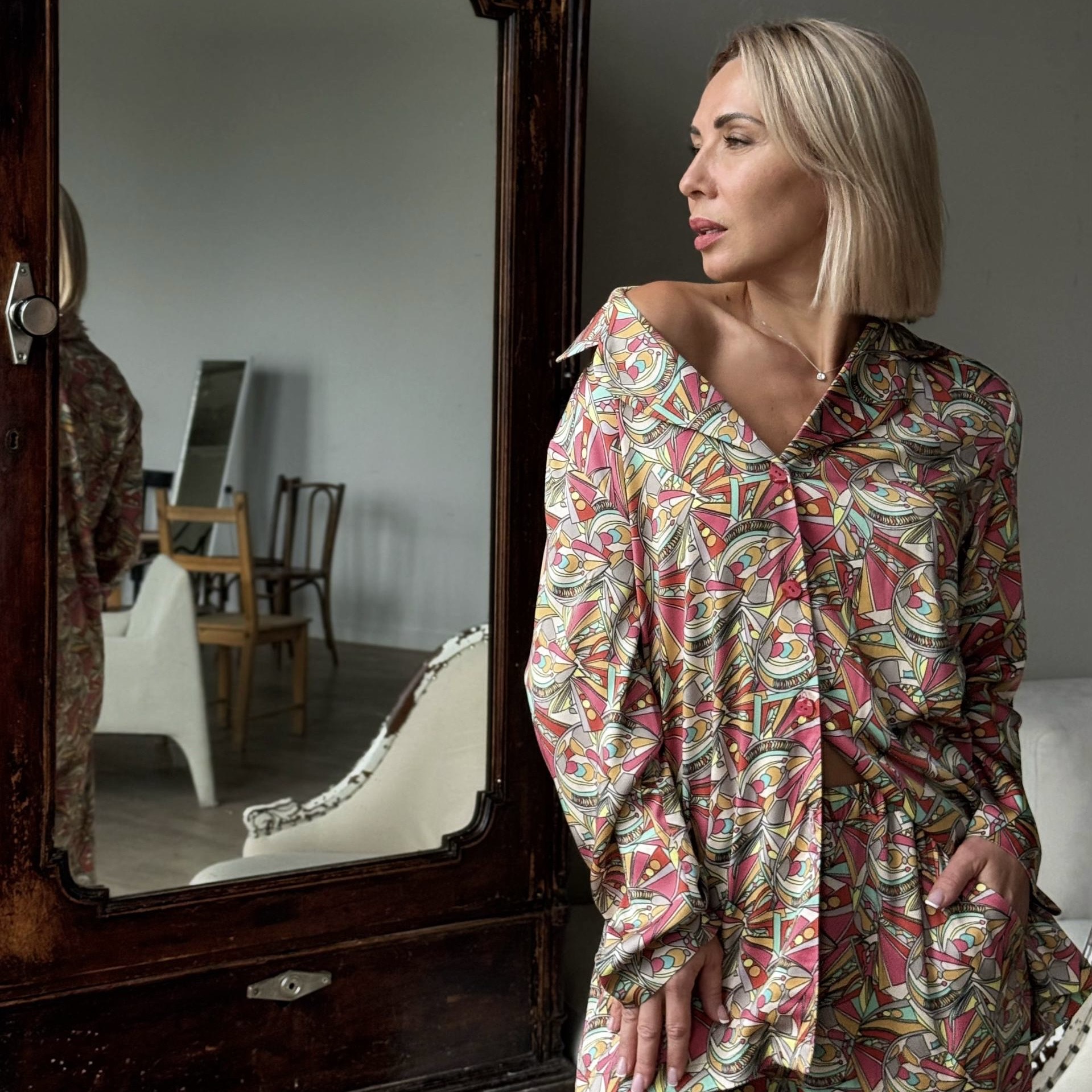 Плательная ткань с сатиновым переплетением, небольшим блеском, немного тянется, не просвечивает. Визуально напоминает шелк. Легкая, хорошо драпируется, не электризуется, дышит. Подойдет для блуз, платьев, костюмов в пижамном стиле, домашней одежды.