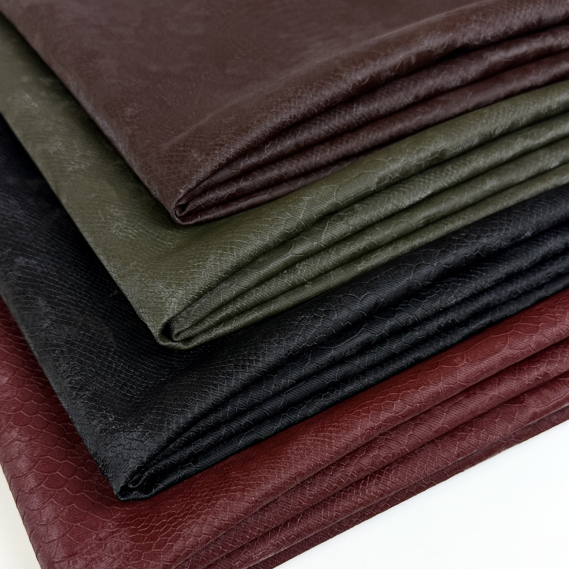 Эко-кожа, средней плотности, тянется, изнанка – тканевая. Подходит для брюк, юбок, шорт, рубашек, тренчей.