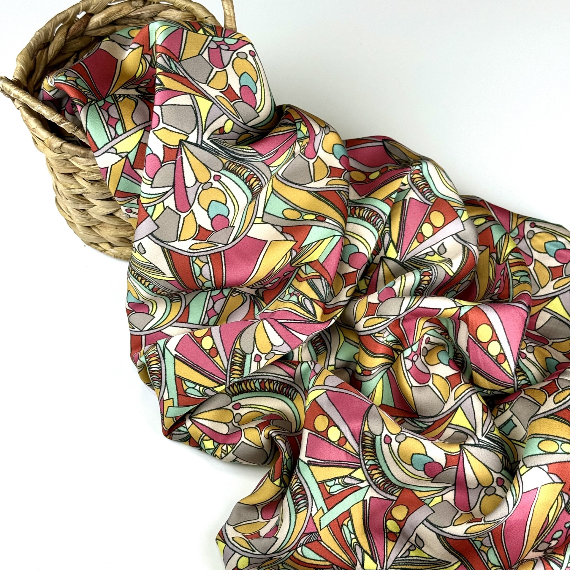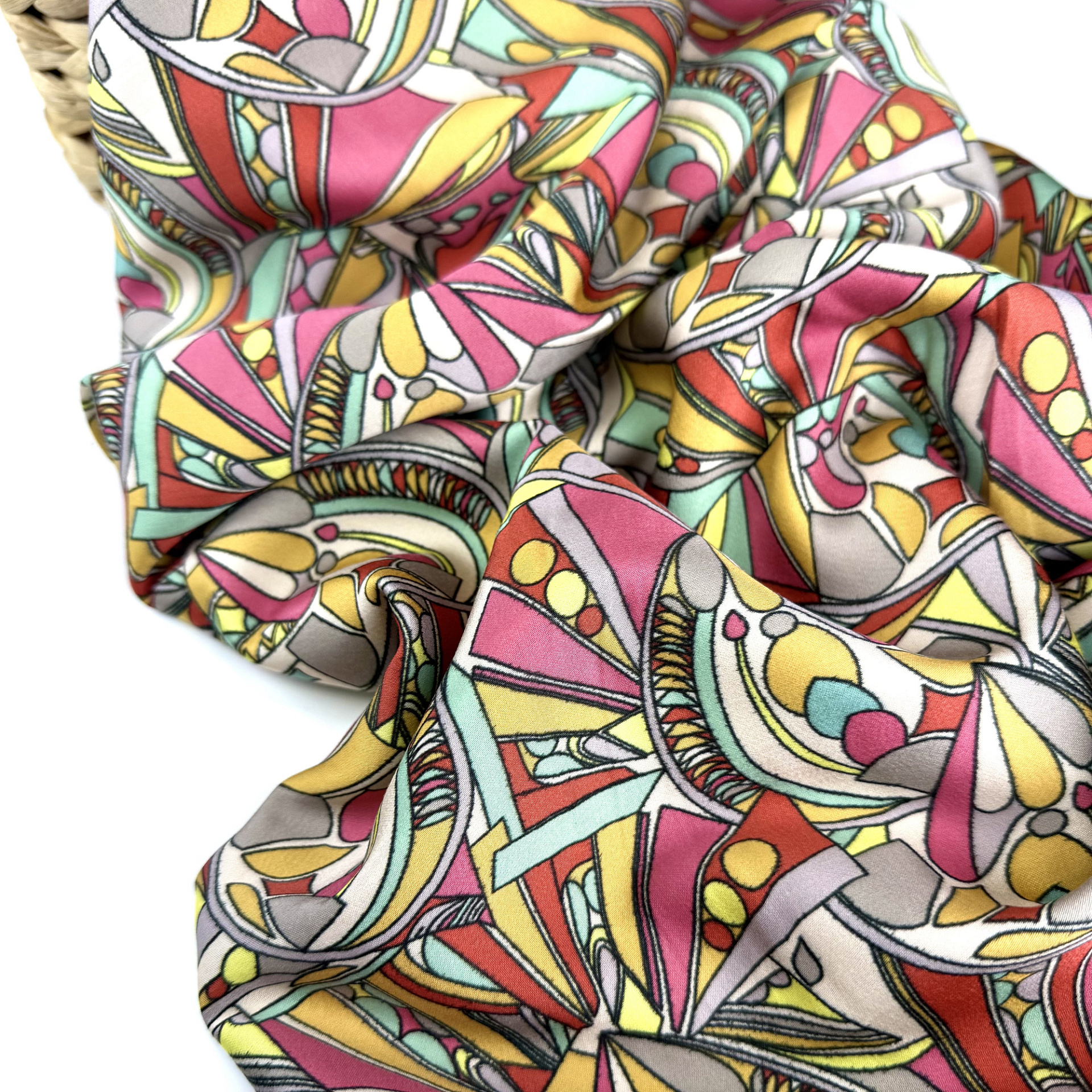 Плательная ткань с сатиновым переплетением, небольшим блеском, немного тянется, не просвечивает. Визуально напоминает шелк. Легкая, хорошо драпируется, не электризуется, дышит. Подойдет для блуз, платьев, костюмов в пижамном стиле, домашней одежды.