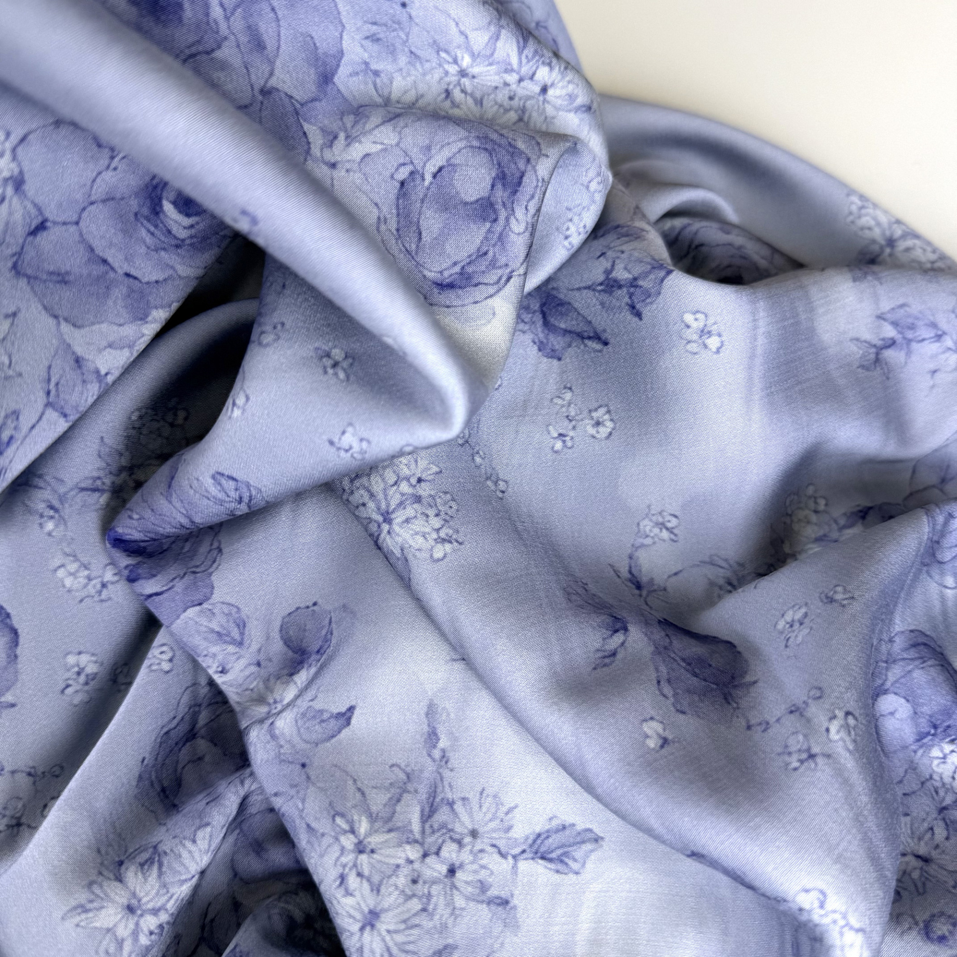 Плательная ткань с сатиновым переплетением, небольшим блеском, немного тянется, не просвечивает. Визуально напоминает шелк. Легкая, хорошо драпируется, не электризуется, дышит. Подойдет для блуз, платьев, костюмов в пижамном стиле, домашней одежды.