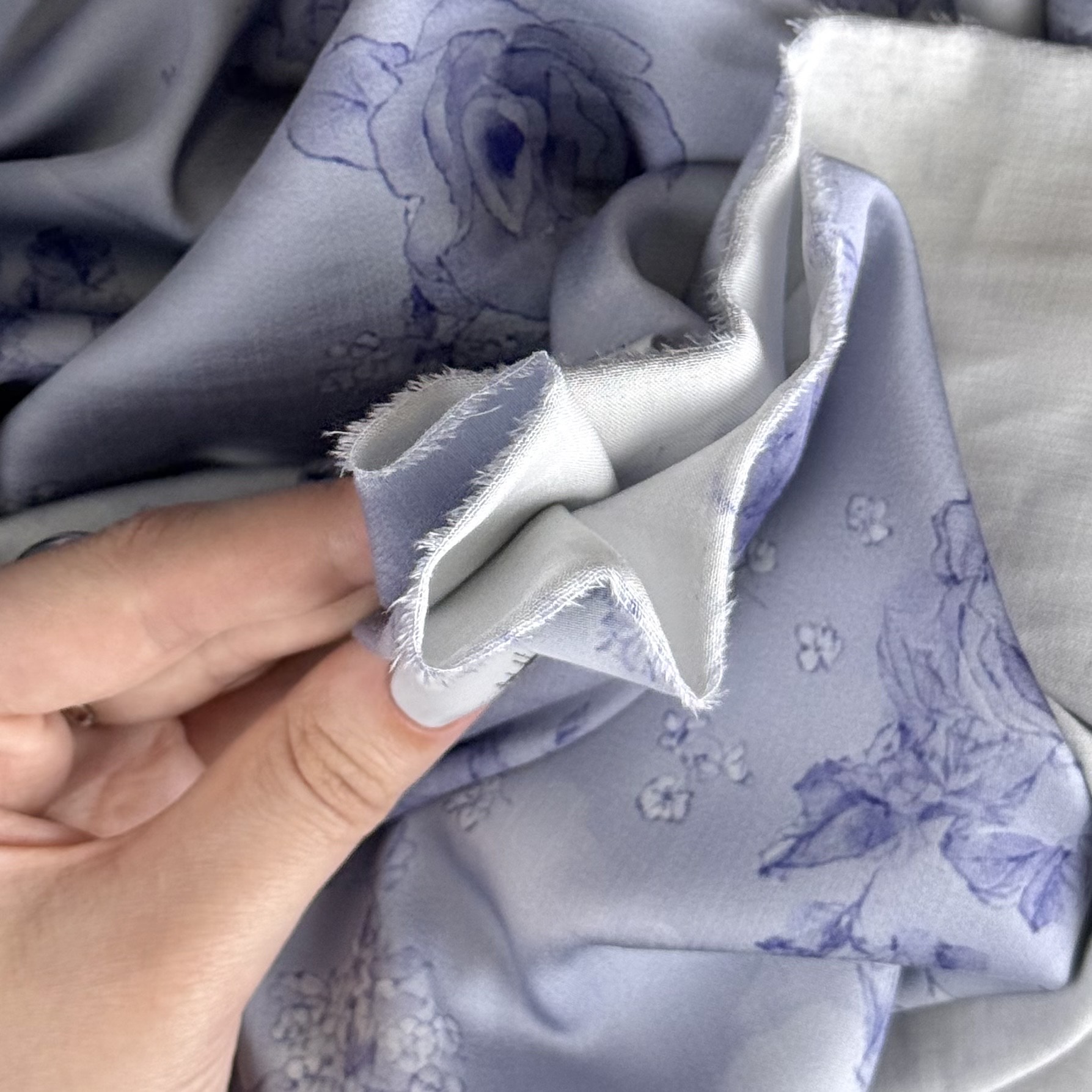 Плательная ткань с сатиновым переплетением, небольшим блеском, немного тянется, не просвечивает. Визуально напоминает шелк. Легкая, хорошо драпируется, не электризуется, дышит. Подойдет для блуз, платьев, костюмов в пижамном стиле, домашней одежды.